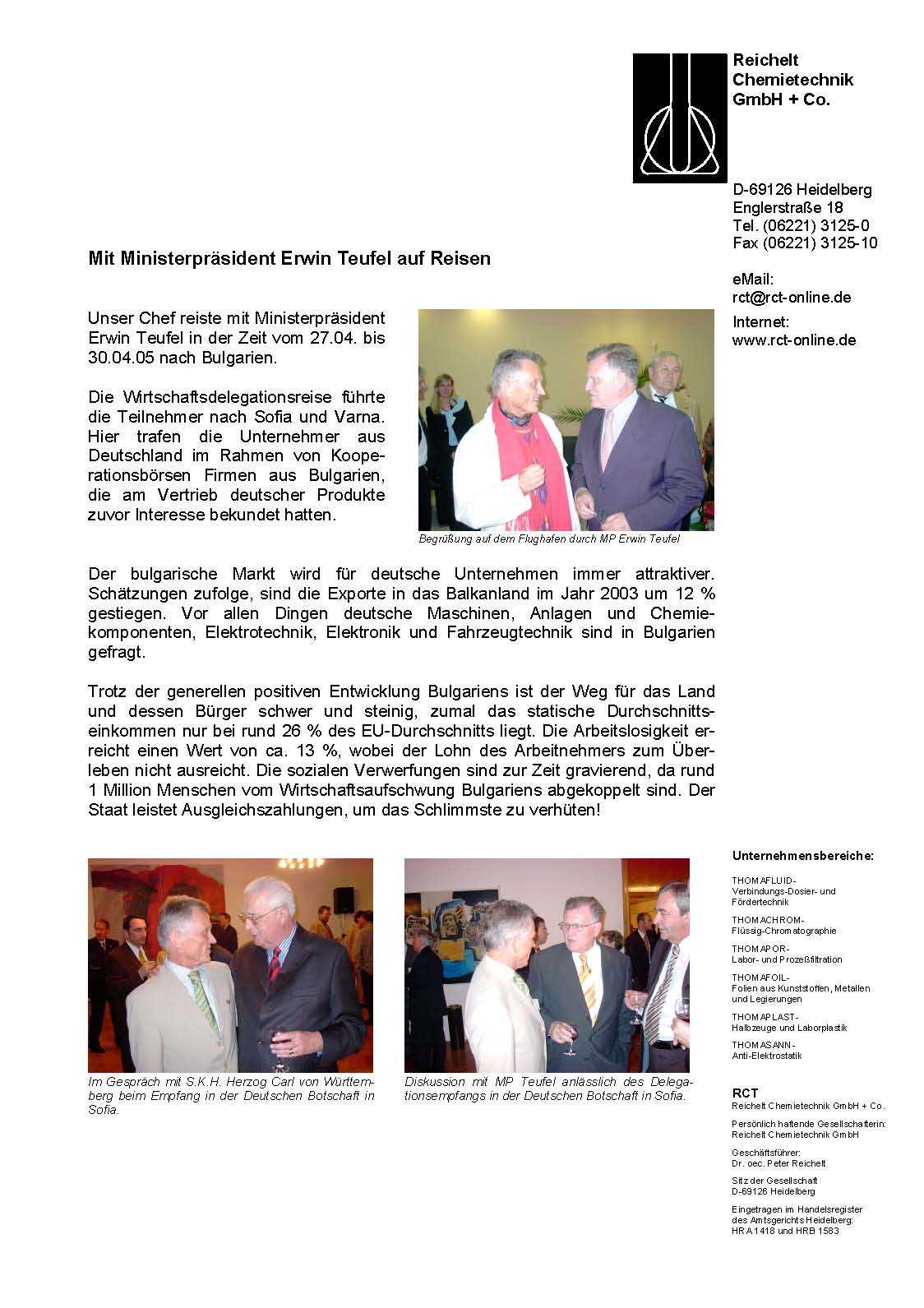 Unser Chef reiste mit Ministerpräsident Erwin Teufel in der Zeit vom 27.-30.04.2005 nach Bulgarien. Die Wirtschaftsdelegationsreise führte die Teilnehmer nach Sofia und Varna...