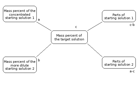 To calculate the volumes of solutions with different concentrations required for mixing or dilution, the mixing cross is used in the chemical laboratory. The mass fraction of the more highly concentrated solution 1 is placed at the upper left, and that of the less concentrated solution 2 at the lower left. The mass percent of the target solution is placed in the center. The proportion of starting solution 1 is obtained from the difference between the mass percent of the target solution and that of starting solution 2. Accordingly, the proportion of starting solution 2 is calculated from the difference between the mass percent of starting solution 1 and that of the target solution.