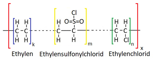 Die nachfolgende Abbildung zeigt schematisch die Struktur von chlorsulfoniertem Polyethylen, wobei die Buchstaben k, m und n verschieden und die einzelnen Gruppen unterschiedlich angeordnet sein können. Die verschiedenen Syntheseprodukte werden alle als chlorsulfoniertes Polyethylen bezeichnet, unterscheiden sich jedoch in ihren chemischen, thermischen und mechanischen Eigenschaften.